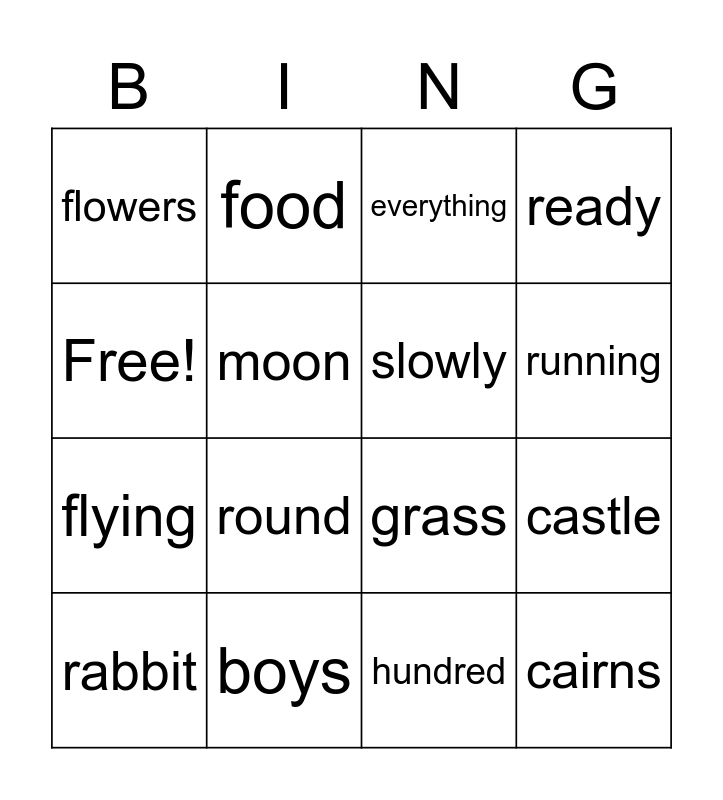 This bingo card has 16 words: boys, castle, everything, flowers, flying, food, grass, hundred, Free!, moon, rabbit, ready, round, running, slowly and cairns.