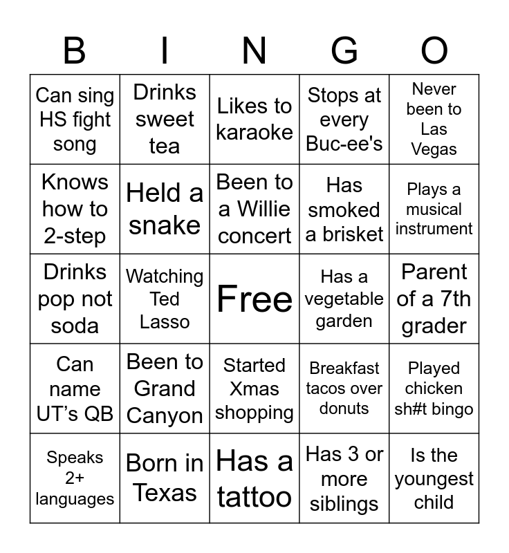 This bingo card has a free space and 30 words: Born in Texas, Has 2 or more pets, Watching Ted Lasso, Wore Halloween costume, Can sing HS fight song, Likes to karaoke, Held a snake, Started Xmas shopping, Has a vegetable garden, Has a tattoo, Parent of a 7th grader, Is the youngest child, Has 3 or more siblings, Likes jalapeños on pizza, Plays a musical instrument, Does not drink coffee, Breakfast tacos over donuts, Can name UT’s QB, Been to Grand Canyon, Never been to Las Vegas, Drinks pop not soda, Makes chili with no beans, Drinks sweet tea, Has smoked a brisket, Knows how to 2-step, Stops at every Buc-ee's, Played chicken sh#t bingo, Speaks 2+ languages, Been to a Willie concert and Parent of a 6th grader.
