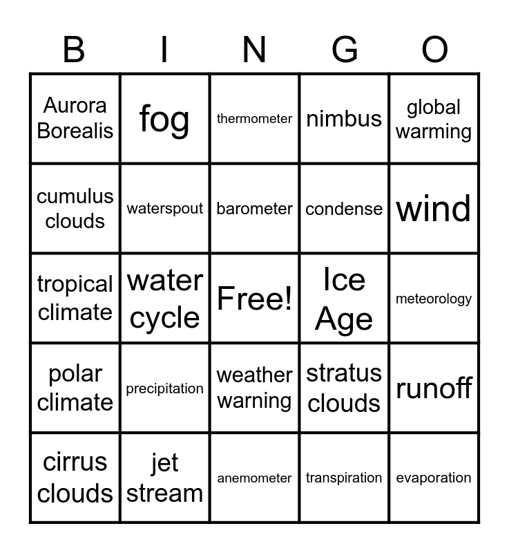 This bingo card has a free space and 29 words: cirrus clouds, troposphere, water cycle, humidity, Aurora Borealis, thermometer, waterspout, precipitation, Ice Age, jet stream, meteorology, evaporation, anemometer, transpiration, wind, atmosphere, weather warning, polar climate, global warming, tropical climate, stratus clouds, hurricane, condense, cumulus clouds, nimbus, fog, runoff, barometer and hygrometer.
