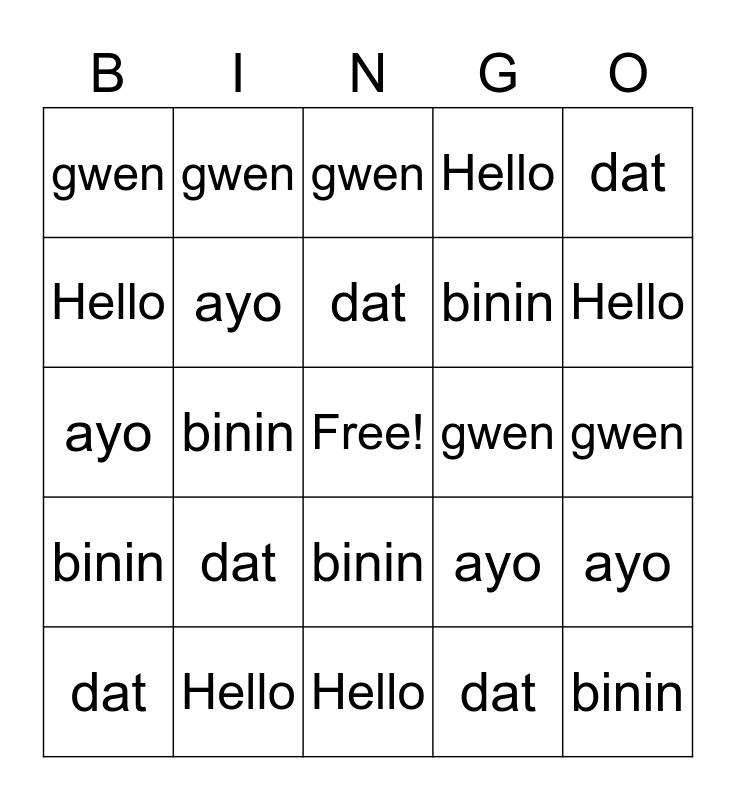 This bingo card has a free space and 24 words: dat, dat, dat, dat, dat, gwen, gwen, gwen, gwen, gwen, ayo, ayo, ayo, ayo, Hello, Hello, Hello, Hello, Hello, binin, binin, binin, binin and binin.