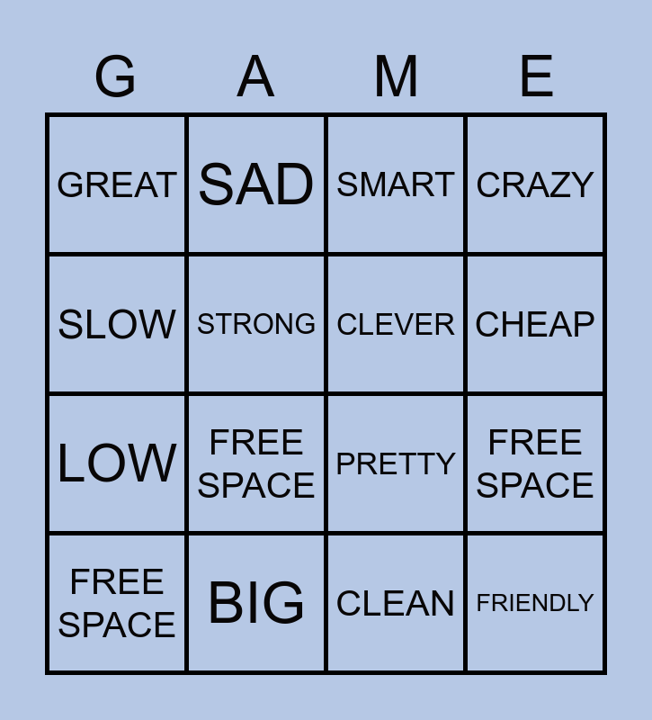 This bingo card has 16 words: BIG, FREE SPACE, SMART, GREAT, LOW, SAD, PRETTY, CLEAN, SLOW, STRONG, FREE SPACE, CRAZY, FREE SPACE, CHEAP, CLEVER and FRIENDLY.