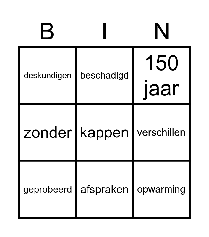This bingo card has 16 words: wereldleiders, klimaatverandering, 150 jaar, deskundigen, opwarming, beschadigd, hittegolf, 1,5 graad, kappen, verschillen, overstromingen, zonder, elkaar, afspraken, geprobeerd and minder.