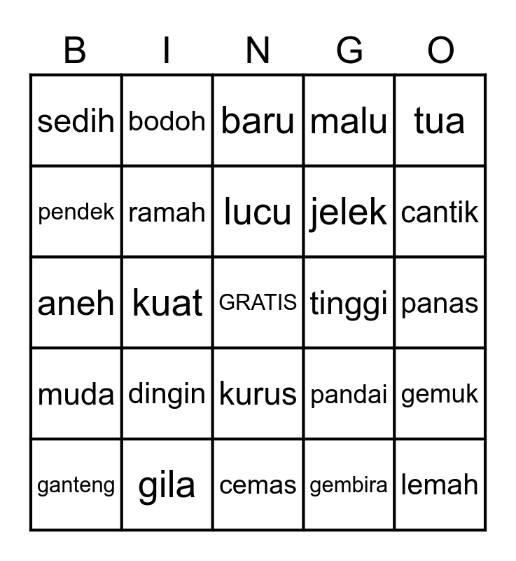 This bingo card has a free space and 24 words: dingin, gila, lucu, ganteng, tua, sedih, pendek, bodoh, tinggi, kurus, jelek, aneh, pandai, gemuk, ramah, gembira, panas, baru, cantik, kuat, lemah, muda, malu and cemas.