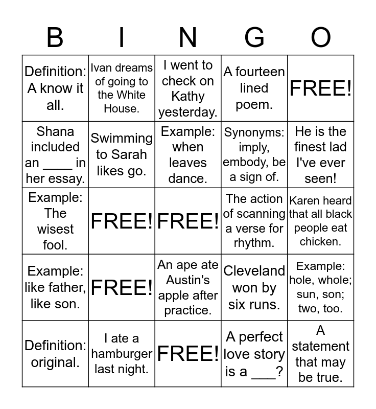 This bingo card has a free space and 24 words: FREE!, I ate a hamburger last night., Example: when leaves dance., Definition: original., FREE!, Definition: A know it all., Shana included an ____ in her essay., Ivan dreams of going to the White House., The action of scanning a verse for rhythm., An ape ate Austin's apple after practice., Synonyms: imply, embody, be a sign of., Example: The wisest fool., Cleveland won by six runs., Example: hole, whole; sun, son; two, too., Swimming to Sarah likes go., A perfect love story is a ___?, Karen heard that all black people eat chicken., I went to check on Kathy yesterday., He is the finest lad I've ever seen!, FREE!, A statement that may be true., Example: like father, like son., A fourteen lined poem. and FREE!.
