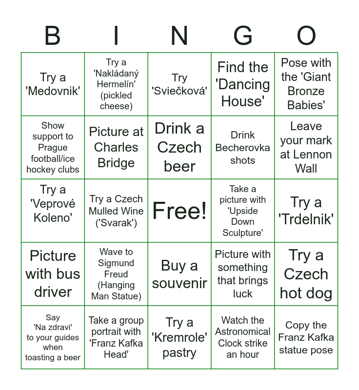 This bingo card has a free space and 24 words: Wave to Sigmund Freud (Hanging Man Statue), Take a group portrait with 'Franz Kafka Head', Drink a Czech beer, Say 'Na zdravi' to your guides when toasting a beer, Pose with the 'Giant Bronze Babies', Try a 'Medovnik', Show support to Prague football/ice hockey clubs, Try a 'Nakládaný Hermelín' (pickled cheese), Take a picture with 'Upside Down Sculpture', Buy a souvenir, Drink Becherovka shots, Try a 'Veprové Koleno', Picture with something that brings luck, Try a Czech hot dog, Picture at Charles Bridge, Watch the Astronomical Clock strike an hour, Try a 'Trdelnik', Try 'Sviečková', Leave your mark at Lennon Wall, Try a Czech Mulled Wine ('Svarak'), Copy the Franz Kafka statue pose, Picture with bus driver, Find the 'Dancing House' and Try a 'Kremrole' pastry.