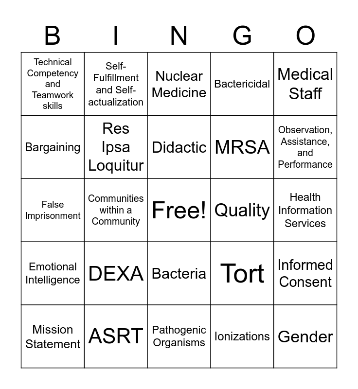 This bingo card has a free space and 24 words: DEXA, ASRT, Didactic, Mission Statement, Medical Staff, Technical Competency and Teamwork skills, Bargaining, Self-Fulfillment and Self-actualization, Quality, Bacteria, MRSA, False Imprisonment, Tort, Informed Consent, Res Ipsa Loquitur, Ionizations, Health Information Services, Nuclear Medicine, Observation, Assistance, and Performance, Communities within a Community, Gender, Emotional Intelligence, Bactericidal and Pathogenic Organisms.
