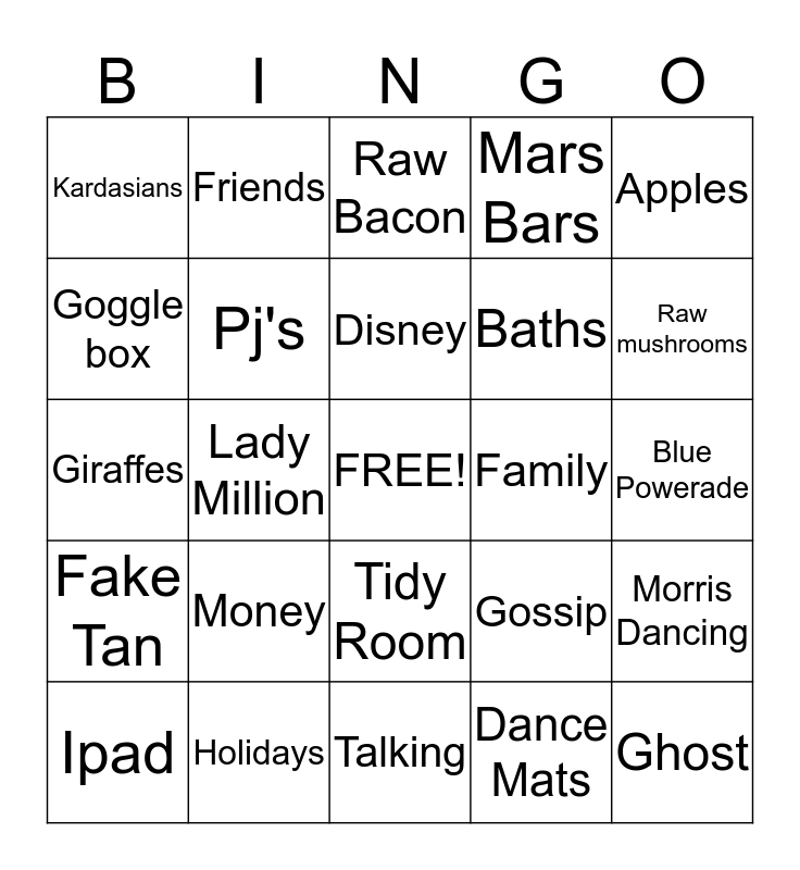 This bingo card has a free space and 24 words: Money, Holidays, Disney, Ipad, Apples, Kardasians, Goggle box, Friends, Family, Tidy Room, Baths, Giraffes, Gossip, Morris Dancing, Pj's, Dance Mats, Blue Powerade, Raw Bacon, Raw mushrooms, Lady Million, Ghost, Fake Tan, Mars Bars and Talking.