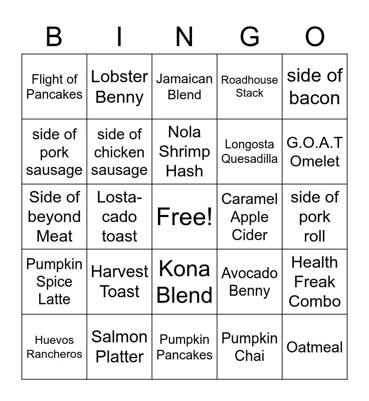 This bingo card has a free space and 24 words: Harvest Toast, Salmon Platter, Nola Shrimp Hash, Huevos Rancheros, side of bacon, Flight of Pancakes, side of pork sausage, Lobster Benny, Caramel Apple Cider, Kona Blend, Longosta Quesadilla, Side of beyond Meat, Avocado Benny, Health Freak Combo, side of chicken sausage, Pumpkin Chai, side of pork roll, Jamaican Blend, G.O.A.T Omelet, Losta-cado toast, Oatmeal, Pumpkin Spice Latte, Roadhouse Stack and Pumpkin Pancakes.