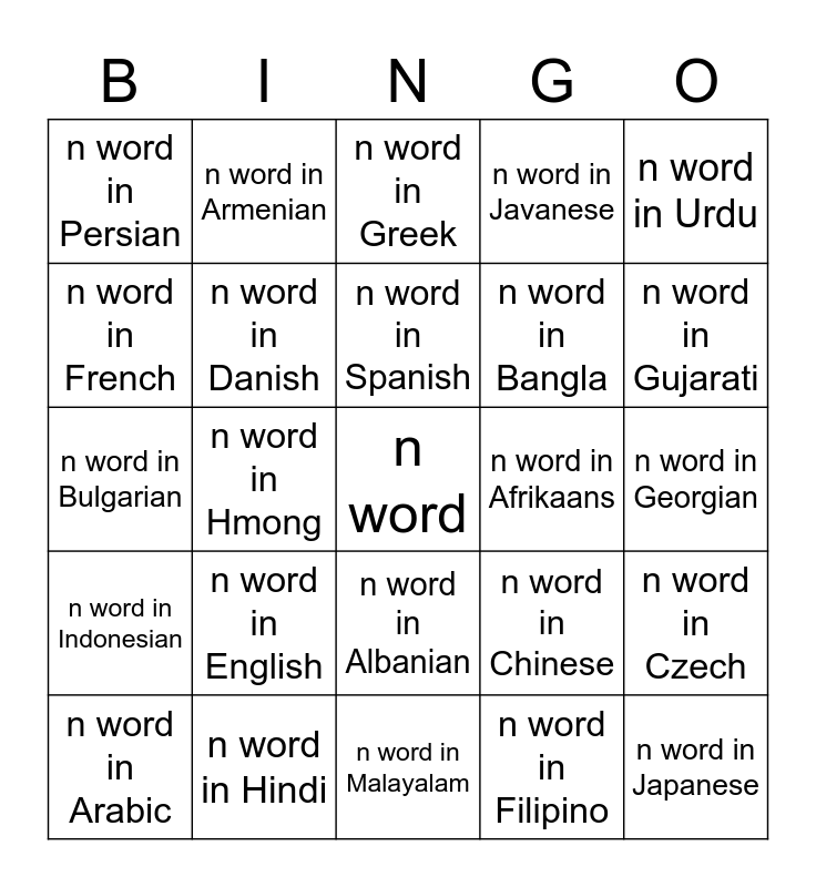 This bingo card has a free space and 24 words: n word in English, n word in Hindi, n word in Spanish, n word in Arabic, n word in Urdu, n word in Persian, n word in French, n word in Armenian, n word in Afrikaans, n word in Albanian, n word in Bangla, n word in Bulgarian, n word in Chinese, n word in Czech, n word in Danish, n word in Filipino, n word in Georgian, n word in Greek, n word in Gujarati, n word in Hmong, n word in Japanese, n word in Indonesian, n word in Javanese and n word in Malayalam.
