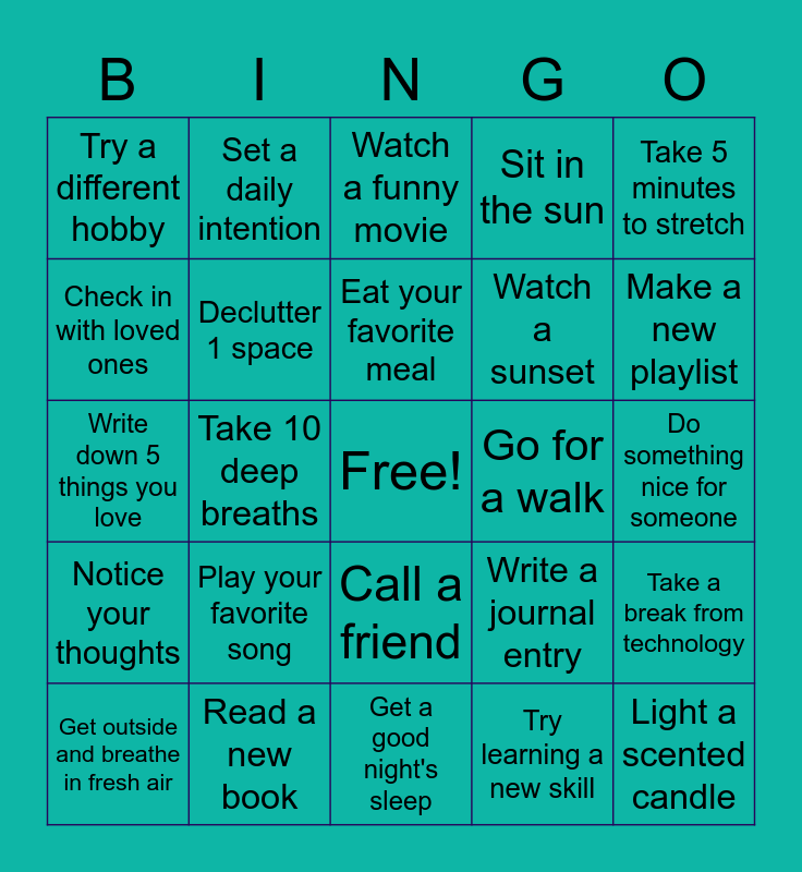 This bingo card has a free space and 24 words: Play your favorite song, Read a new book, Eat your favorite meal, Get outside and breathe in fresh air, Take 5 minutes to stretch, Try a different hobby, Check in with loved ones, Set a daily intention, Go for a walk, Call a friend, Watch a sunset, Write down 5 things you love, Write a journal entry, Take a break from technology, Declutter 1 space, Try learning a new skill, Do something nice for someone, Watch a funny movie, Make a new playlist, Take 10 deep breaths, Light a scented candle, Notice your thoughts, Sit in the sun and Get a good night's sleep.