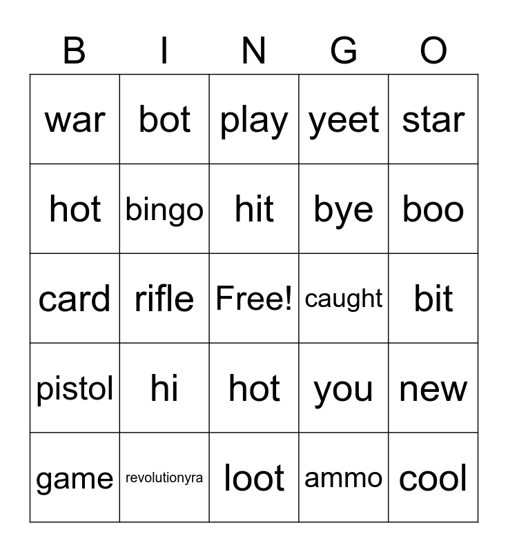 This bingo card has a free space and 24 words: hi, revolutionyra, hit, game, star, war, hot, bot, caught, hot, bye, card, you, new, bingo, ammo, bit, play, boo, rifle, cool, pistol, yeet and loot.