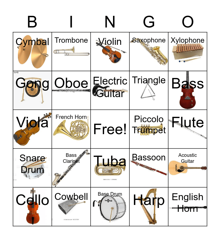 This bingo card has 29 images, a free space and 29 words: Cello, Clarinet, French Horn, Timpani, Cymbal, Violin, Oboe, Bass Clarinet, Piccolo Trumpet, Cowbell, Flute, English Horn, Base Drum, Harp, Bass, Contra Bassoon, Tuba, Snare Drum, Xylophone, Viola, Bassoon, Trumpet, Triangle, Gong, Saxophone, Trombone, Acoustic Guitar, Electric Guitar and Bass Guitar.