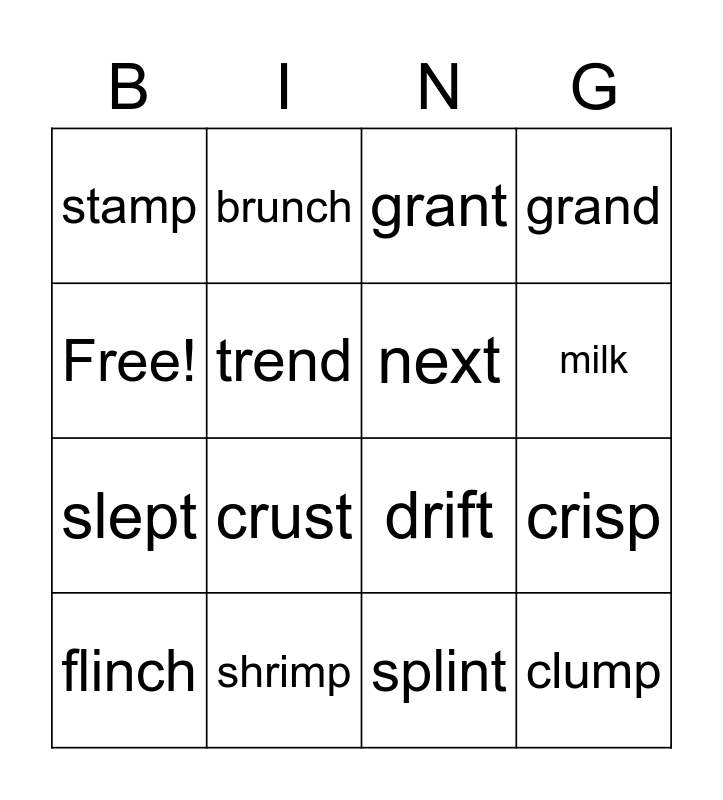 This bingo card has 16 words: shrimp, crisp, grant, stamp, slept, brunch, drift, splint, Free!, trend, flinch, grand, crust, milk, next and clump.