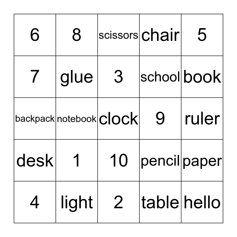 This bingo card has 25 words: 1, 2, 3, 4, 5, 6, 7, 8, 9, 10, school, backpack, pencil, paper, glue, hello, ruler, scissors, book, notebook, clock, light, desk, chair and table.