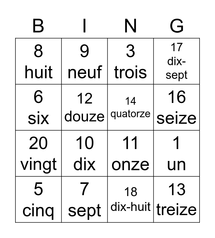 This bingo card has 20 words: 1 un, 2 deux, 3 trois, 4 quatre, 5 cinq, 6 six, 7 sept, 8 huit, 20 vingt, 9 neuf, 10 dix, 11 onze, 12 douze, 13 treize, 14 quatorze, 15 quinze, 16 seize, 17 dix-sept, 18 dix-huit and 19 dix-neuf.