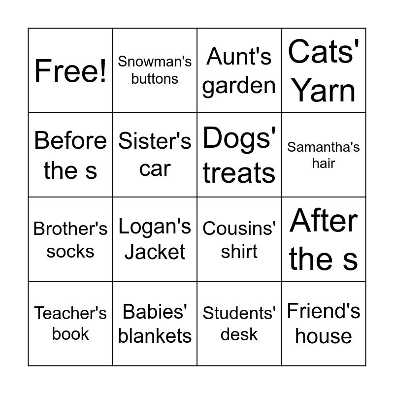 This bingo card has 16 words: Teacher's book, Babies' blankets, Aunt's garden, Cats' Yarn, Before the s, Snowman's buttons, Cousins' shirt, After the s, Free!, Sister's car, Students' desk, Samantha's hair, Brother's socks, Logan's Jacket, Dogs' treats and Friend's house.