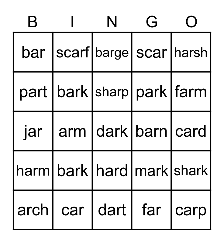 This bingo card has a free space and 29 words: arch, ark, arm, art, bar, barge, bark, bark, barn, car, card, carp, dart, far, farm, guard, hard, harm, harsh, jar, mark, marsh, park, part, scar, scarf, shark, sharp and smart.