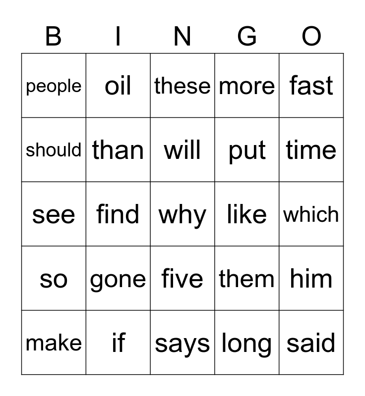 This bingo card has 25 words: gone, says, will, make, fast, people, should, oil, like, five, put, see, them, him, than, said, which, these, time, find, why, if, so, more and long.