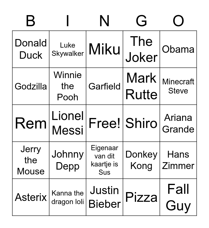 This bingo card has a free space and 69 words: Vladimir Putin, Ariana Grande, Yagami Light, Kenny McCormick, Kanna the dragon loli, Ash Ketchum, The Joker, Geralt of Rivia, Obama, Shreks Oma, Hans Zimmer, Je Moeder, Donald Duck, Miku, SpongeBob SquarePants, Lionel Messi, Eigenaar van dit kaartje is Sus, Mark Rutte, Jack Sparrow, Jerry the Mouse, Shiro, Donkey Kong, Minecraft Steve, Lelouch Lamperouge, Mickey Mouse, Donald Trump, Harry Potter, John Wick, Pizza, Alfred Judokus Kwak, Luke Skywalker, Pikachu, Bidoof, The Pope, Kirino Kousaka, Morgan Freeman, Pac Man, Taylor Swift, Godzilla, Kabouter Wesley, Johnny Depp, Fall Guy, Peter Pan, Eeyore, Super Opa, Asterix, James Bond, Megumin, Eric Cartman, Winnie the Pooh, Garfield, Urs Wyder, Paimon, Justin Bieber, Daniel Craig, Usain Bolt, Mario, Yoshi, Patrick Star, Rem, Michael van Gerwen, Tweety, Homer Simpson, Sherlock Holmes, OwO, UwU, Corona Chan, De uitwerpselen van niek and Bingo!.