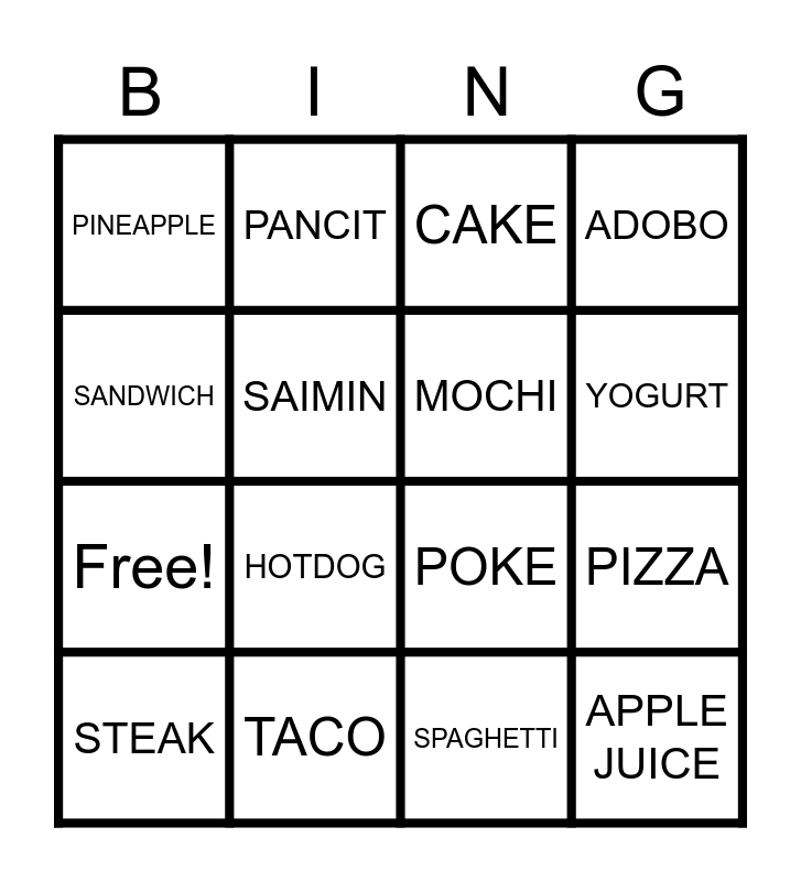 This bingo card has 20 words: PIZZA, ICE CREAM, CAKE, LUMPIA, STEAK, SANDWICH, TACO, PINEAPPLE, Free!, PANCIT, HOTDOG, POKE, SAIMIN, APPLE JUICE, MOCHI, FRIED CHICKEN, YOGURT, ADOBO, SPAGHETTI and SUSHI.
