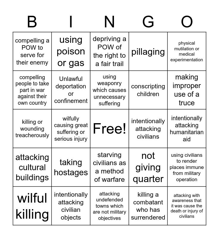 This bingo card has a free space and 29 words: wilful killing, torture or inhuman treatment (including biological experiments), wilfully causing great suffering or serious injury, extensive destruction and appropriation of property, compelling a POW to serve for their enemy, depriving a POW of the right to a fair trail, Unlawful deportation or confinement, taking hostages, intentionally attacking civilians, intentionally attacking civilian objects, intentionally attacking humanitarian aid, attacking with awareness that it was cause the death or injury of civilians, attacking undefended towns which are not military objectives, killing a combatant who has surrendered, making improper use of a truce, making improper use of the emblems of the enemy, the UN or Geneva Convention, starving civilians as a method of warfare, attacking cultural buildings, physical mutilation or medical experimentation, killing or wounding treacherously, not giving quarter, destroying the enemy's property (unless it's necessary), conscripting children, compelling people to take part in war against their own country, pillaging, using poison or gas, using civilians to render places immune from military operation, using weaponry which causes unnecessary suffering and committing outrages on personal dignity.