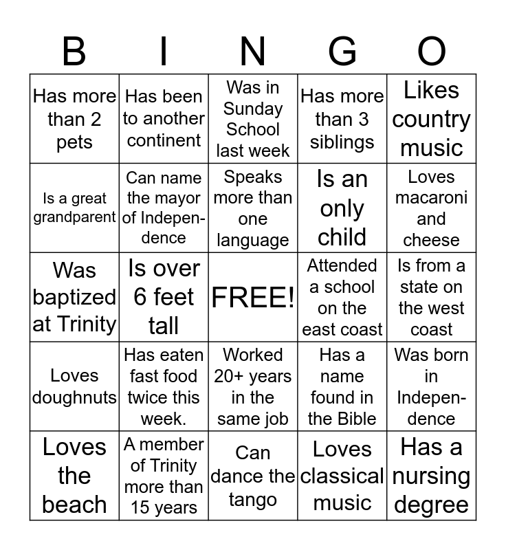 This bingo card has a free space and 24 words: Has eaten fast food twice this week., A member of Trinity more than 15 years, Speaks more than one language, Loves the beach, Likes country music, Has more than 2 pets, Is a great grandparent, Has been to another continent, Attended a school on the east coast, Worked 20+ years in the same job, Is an only child, Was baptized at Trinity, Has a name found in the Bible, Was born in Indepen-dence, Can name the mayor of Indepen-dence, Loves classical music, Is from a state on the west coast, Was in Sunday School last week, Loves macaroni and cheese, Is over 6 feet tall, Has a nursing degree, Loves doughnuts, Has more than 3 siblings and Can dance the tango.