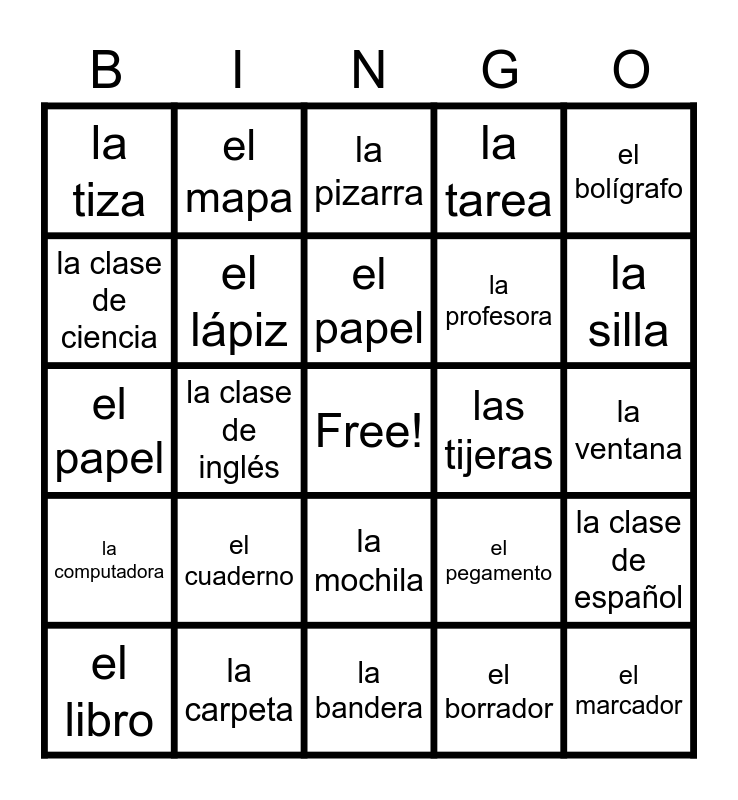 This bingo card has a free space and 34 words: el bolígrafo, el borrador, la calculadora, el calendario, la computadora, el lápiz, el bolígrafo, el libro, el mapa, la mesa, el papel, la pizarra, el reloj, el sacapuntas, las tijeras, la silla, la carpeta, el papel, el cuaderno, el pegamento, la mochila, la regla, la tiza, la ventana, la bandera, el marcador, la tarea, el profesor, la profesora, la clase de ciencia, la clase de matemáticas, la clase de inglés, la clase de español and la clase de historia.