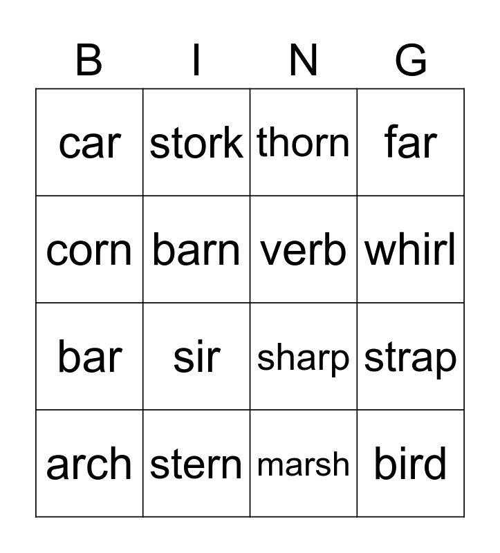 This bingo card has 32 words: turn, burn, strap, nerd, bird, verb, corn, thrown, stork, card, whirl, thorn, sword, star, stern, herd, hurl, sharp, scar, shark, horn, born, marsh, north, arch, far, bar, barn, car, jar, curl and sir.