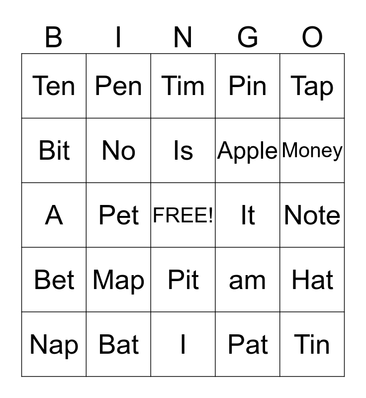 This bingo card has a free space and 24 words: Map, Bat, Is, Nap, Tap, Ten, Bit, Pen, It, Pit, Apple, A, am, Hat, No, Pat, Note, Tim, Money, Pet, Tin, Bet, Pin and I.