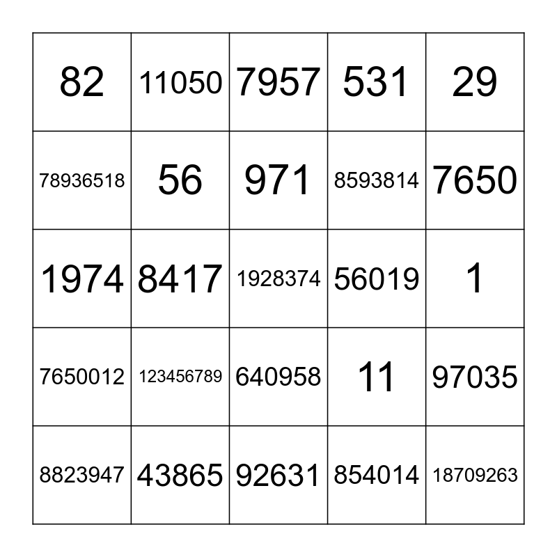 This bingo card has 40 words: 777, 1974, 19, 56, 43865, 640958, 971, 594, 29, 7650012, 8417, 531, 1928374, 1, 56019, 123456789, 98473062, 82, 98374, 7957, 97035, 854014, 8593814, 78936518, 987654321, 2021, 994, 69834, 18709263, 4449019, 69287, 8823947, 640127, 11, 7650, 92631, 564738291, 76854932, 11050 and 7239.