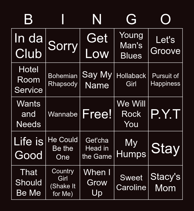 This bingo card has a free space and 41 words: Livin la Vida Loca, Wants and Needs, I Gotta Feeling, Bohemian Rhapsody, Country Girl (Shake It for Me), Get'cha Head in the Game, Say My Name, Toxic, Let's Groove, Life is Good, Wannabe, Young Man's Blues, Stacy's Mom, P.Y.T, We Will Rock You, He Could Be the One, Livin' on a Prayer, In da Club, Hello, Get Low, Stay, It Wasn't Me, When I Grow Up, Hollaback Girl, Like a G6, Memories, Sweet Caroline, Way 2 Sexy, Pursuit of Happiness, Rain on Me, We Can't Stop, Sorry, That Should Be Me, Adore You, My Humps, Hotel Room Service, Heartless, Give Me Everything, All Star, When Doves Cry and I Want It That Way.