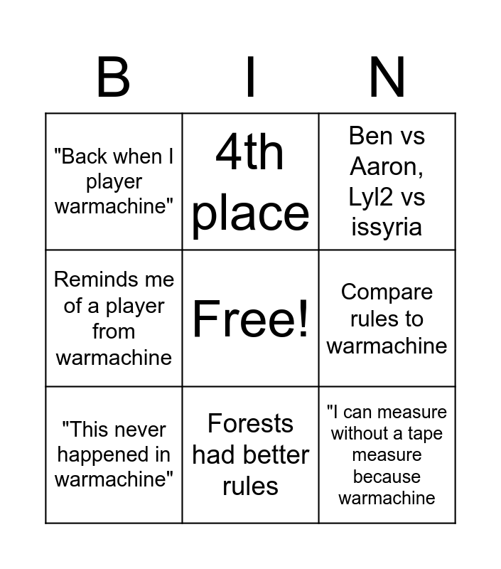 This bingo card has a free space and 8 words: Compare rules to warmachine, Ben vs Aaron, Lyl2 vs issyria, 4th place, "This never happened in warmachine", "Back when I player warmachine", "I can measure without a tape measure because warmachine, Reminds me of a player from warmachine and Forests had better rules.