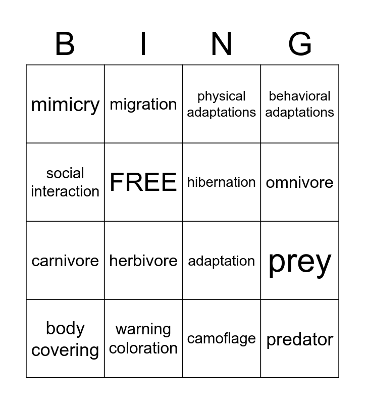 This bingo card has 17 words: camoflage, body covering, physical adaptations, mimicry, herbivore, behavioral adaptations, prey, hibernation, omnivore, FREE, warning coloration, adaptation, social interaction, migration, carnivore, learned behavior and predator.