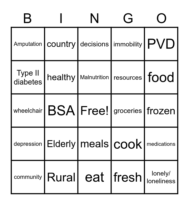 This bingo card has a free space and 24 words: Elderly, Rural, Malnutrition, community, PVD, Amputation, Type II diabetes, country, groceries, meals, resources, wheelchair, cook, medications, healthy, fresh, frozen, decisions, food, BSA, lonely/ loneliness, depression, immobility and eat.