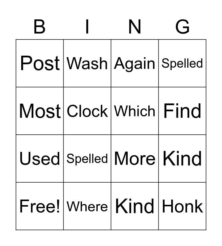 This bingo card has 23 words: Honk, Colt, Find, Pink, Most, Post, Clock, Wash, Free!, There, Spelled, Used, Kicker, Played, Where, Wild, Again, More, Which, Kind, Spelled, Kind and Where.