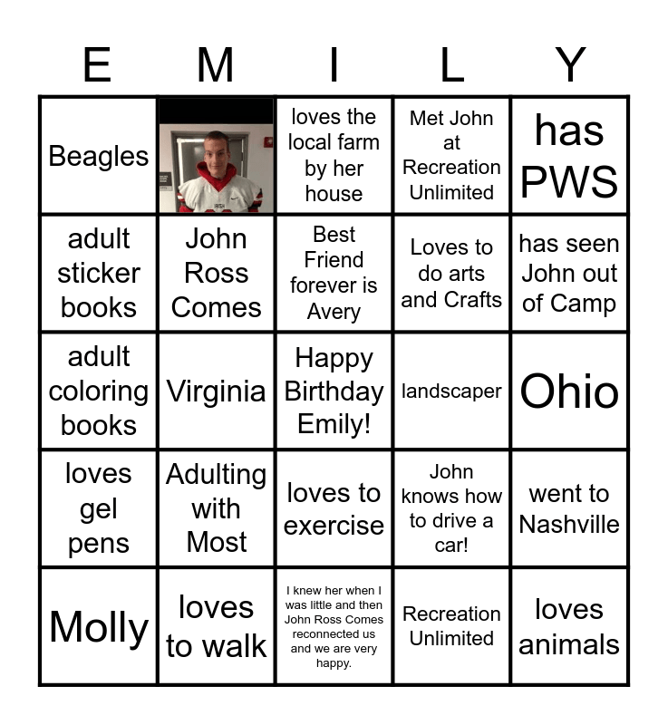This bingo card has 1 images, a free space and 23 words: Adulting with Most, loves to walk, Best Friend forever is Avery, Molly, has PWS, Beagles, adult sticker books, landscaper, loves to exercise, Loves to do arts and Crafts, adult coloring books, John knows how to drive a car!, went to Nashville, John Ross Comes, Recreation Unlimited, Ohio, loves the local farm by her house, has seen John out of Camp, Virginia, loves animals, loves gel pens, Met John at Recreation Unlimited and I knew her when I was little and then John Ross Comes reconnected us and we are very happy..