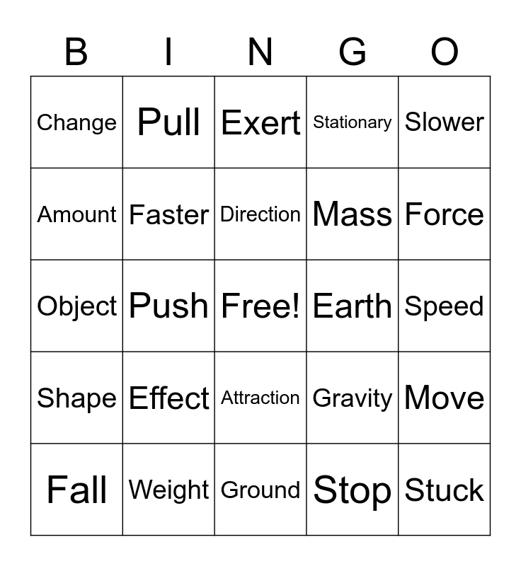 This bingo card has a free space and 24 words: Effect, Weight, Direction, Fall, Slower, Change, Amount, Pull, Earth, Attraction, Mass, Object, Gravity, Move, Faster, Stop, Speed, Exert, Force, Push, Stuck, Shape, Stationary and Ground.