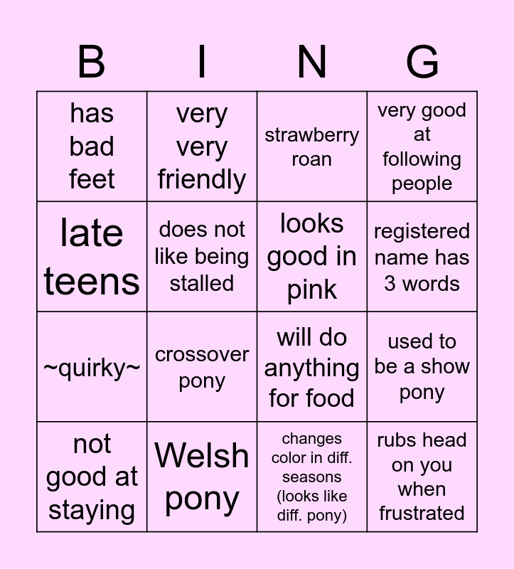 This bingo card has 16 words: Welsh pony, used to be a show pony, strawberry roan, has bad feet, ~quirky~, very very friendly, will do anything for food, changes color in diff. seasons (looks like diff. pony), late teens, does not like being stalled, not good at staying, very good at following people, crossover pony, registered name has 3 words, looks good in pink and rubs head on you when frustrated.