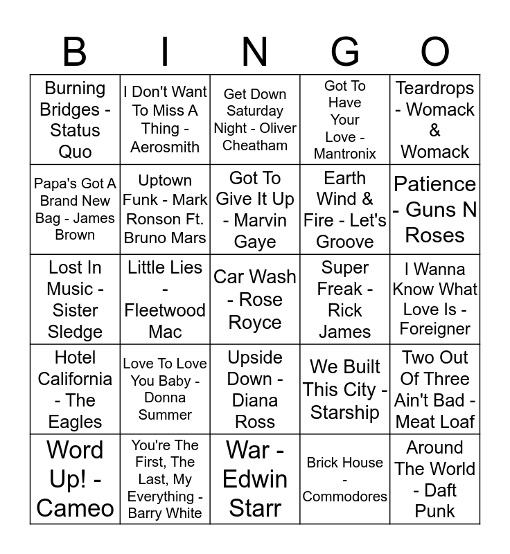 This bingo card has 45 words: Sexmachine - James Brown, Car Wash - Rose Royce, Get Down On It - Kool & The Gang, Word Up! - Cameo, Walk The Dinosaur - Was (Not Was), Brick House - Commodores, Get Down Saturday Night - Oliver Cheatham, Treat Her Like A Lady - The Temptations, Teardrops - Womack & Womack, You're The First, The Last, My Everything - Barry White, Got To Have Your Love - Mantronix, Super Freak - Rick James, Upside Down - Diana Ross, Love To Love You Baby - Donna Summer, ABC - Jackson 5, War - Edwin Starr, Shake Your Groove Thing - Peaches & Herb, Lost In Music - Sister Sledge, Always - Bon Jovi, Patience - Guns N Roses, I Don't Want To Miss A Thing - Aerosmith, I Want To Break Free - Queen, Nothing Else Matters - Metallica, Burning Bridges - Status Quo, Don't Stop Believin' - Journey, I Wanna Know What Love Is - Foreigner, Here I Go Again - Whitesnake, When Love And Hate Collide - Def Leppard, We Built This City - Starship, Hotel California - The Eagles, All Right Now - Free, Two Out Of Three Ain't Bad - Meat Loaf, Every Rose Has It's Thorn - Poison, Otherside - Red Hot Chilli Peppers, I Won't Back Down - Tom Petty & The Heartbreakers, Little Lies - Fleetwood Mac, I Can't Get No ( Satisfaction ) - The Rolling Stones, Dancing In The Moonlight - Thin Lizzy, Around The World - Daft Punk, Got To Give It Up - Marvin Gaye, Papa's Got A Brand New Bag - James Brown, Earth Wind & Fire - Let's Groove, Love Rollercoaster - Ohio Players, Uptown Funk - Mark Ronson Ft. Bruno Mars and Workin' Day And Night - Michael Jackson.