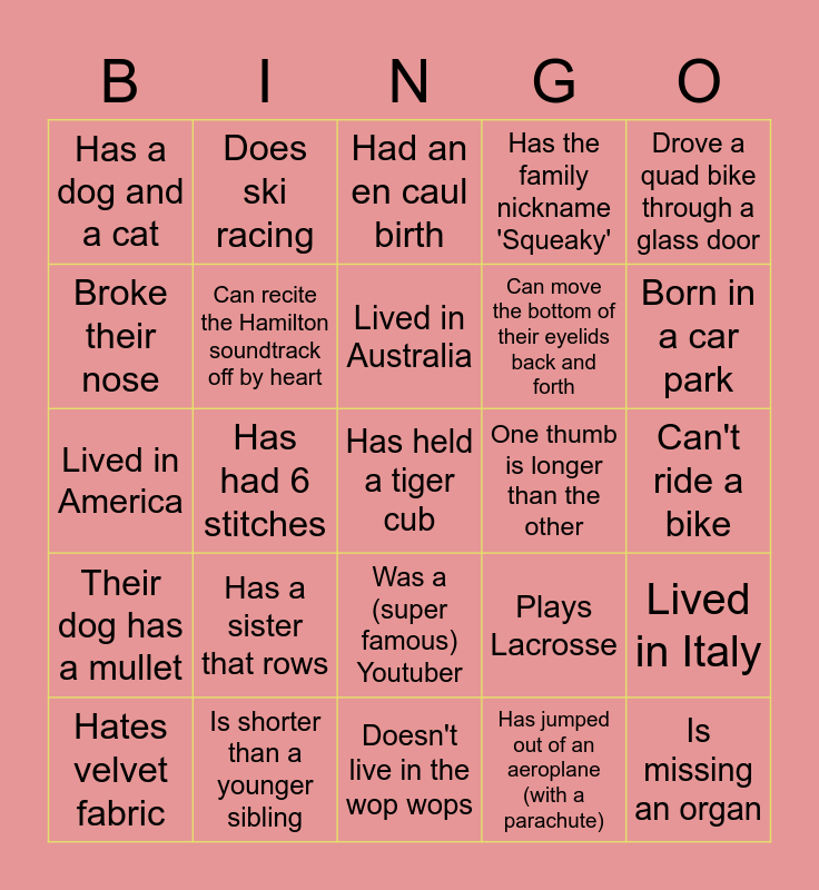 This bingo card has a free space and 24 words: Has a sister that rows, Is shorter than a younger sibling, Lived in Australia, Hates velvet fabric, Drove a quad bike through a glass door, Has a dog and a cat, Broke their nose, Does ski racing, One thumb is longer than the other, Was a (super famous) Youtuber, Can move the bottom of their eyelids back and forth, Lived in America, Plays Lacrosse, Lived in Italy, Can recite the Hamilton soundtrack off by heart, Has jumped out of an aeroplane (with a parachute), Can't ride a bike, Had an en caul birth, Born in a car park, Has had 6 stitches, Is missing an organ, Their dog has a mullet, Has the family nickname 'Squeaky' and Doesn't live in the wop wops.