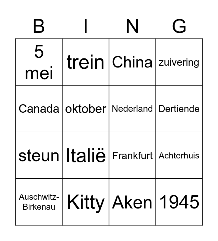 This bingo card has 28 words: zogenoemde, 25 april, steun, bladzijde, oktober, China, trein, 1945, Kitty, Westerbork, Frankfurt, zuivering, Prinsengracht, uiteindelijk, Italië, miljoenen, Otto, Nederland, Dertiende, besloten, 5 mei, Bergen-Belsen, Auschwitz-Birkenau, Achterhuis, Aken, Adolf-Hitler, Canada and Geallieerden.