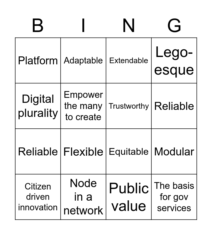 This bingo card has 16 words: Node in a network, Modular, Extendable, Platform, Reliable, Adaptable, Equitable, Public value, Digital plurality, Empower the many to create, Citizen driven innovation, Lego-esque, Flexible, Reliable, Trustworthy and The basis for gov services.