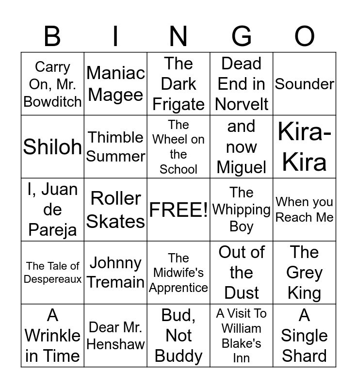 This bingo card has a free space and 29 words: A Wrinkle in Time, The Matchbox Gun, Roller Skates, Miss Hickory, Carry On, Mr. Bowditch, The Dark Frigate, Thimble Summer, Johnny Tremain, The Whipping Boy, Dear Mr. Henshaw, When you Reach Me, A Single Shard, Bud, Not Buddy, A Visit To William Blake's Inn, Kira-Kira, M.C. Higgins, the Great, The Midwife's Apprentice, The Tale of Despereaux, Sounder, I, Juan de Pareja, Out of the Dust, The Slave Dancer, and now Miguel, Shiloh, Dead End in Norvelt, Maniac Magee, The Grey King, The Wheel on the School and Miss Hickory.