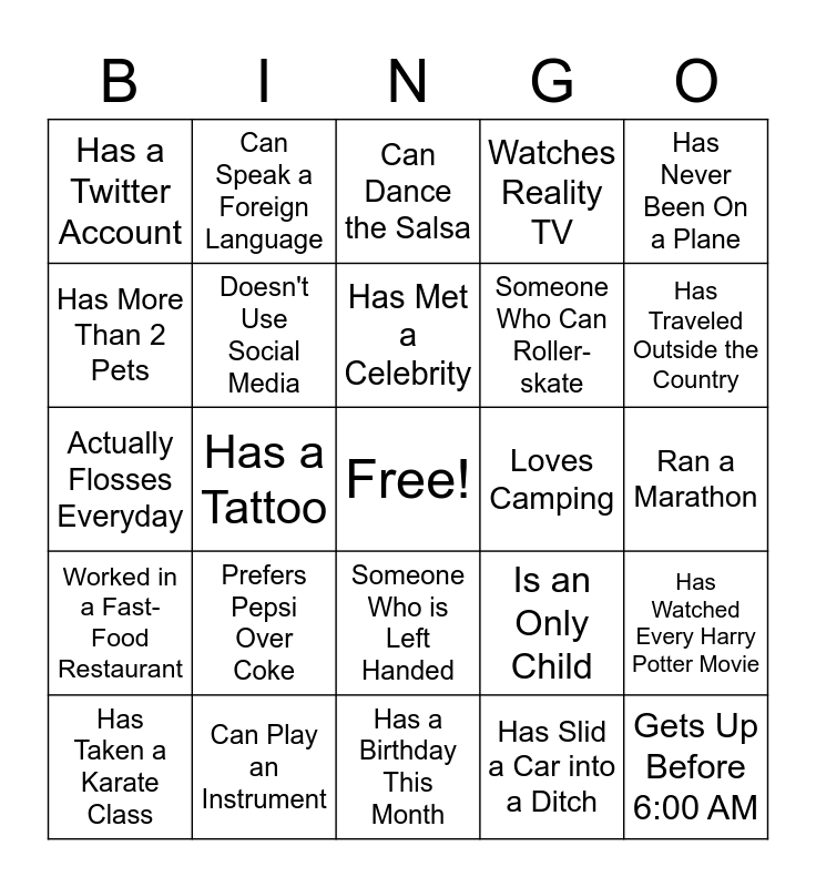 This bingo card has a free space and 35 words: Favorite Season is Autumn, Went to an Outdoor Concert, Had Braces, Doesn't Use Social Media, Someone Who is Left Handed, Watches Reality TV, Has More Than 2 Pets, Doesn't Eat Meat, Has Met a Celebrity, Hates Pizza, Actually Flosses Everyday, Has Never Been On a Plane, Has Served on a Jury, Has Never Seen a Star Wars Movie, Has a Twitter Account, Loves Camping, Has Slid a Car into a Ditch, Has a Tattoo, Worked in a Fast-Food Restaurant, Gets Up Before 6:00 AM, Is an Only Child, Has Taken a Karate Class, Has Watched Every Harry Potter Movie, Can Play an Instrument, Can Dance the Salsa, Has Traveled Outside the Country, Has a Collection, Has Gone Scuba Diving, Someone Who Can Roller-skate, Ran a Marathon, Has Never Ridden a Horse, Has a Birthday This Month, Prefers Pepsi Over Coke, Can Speak a Foreign Language and Doesn't Drink Coffee.