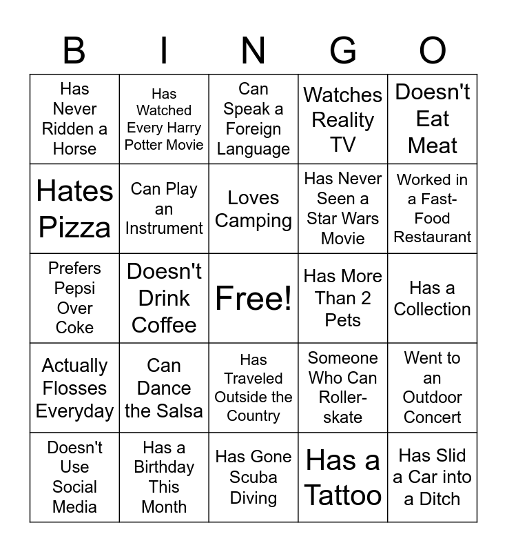 This bingo card has a free space and 35 words: Gets Up Before 6:00 AM, Has Met a Celebrity, Favorite Season is Autumn, Can Play an Instrument, Has Traveled Outside the Country, Watches Reality TV, Hates Pizza, Has Never Been On a Plane, Loves Camping, Has Served on a Jury, Prefers Pepsi Over Coke, Doesn't Eat Meat, Ran a Marathon, Had Braces, Has Never Ridden a Horse, Has More Than 2 Pets, Has a Tattoo, Doesn't Drink Coffee, Actually Flosses Everyday, Has Slid a Car into a Ditch, Someone Who Can Roller-skate, Doesn't Use Social Media, Went to an Outdoor Concert, Has a Birthday This Month, Can Speak a Foreign Language, Worked in a Fast-Food Restaurant, Has a Twitter Account, Someone Who is Left Handed, Has Never Seen a Star Wars Movie, Has a Collection, Is an Only Child, Has Gone Scuba Diving, Can Dance the Salsa, Has Watched Every Harry Potter Movie and Has Taken a Karate Class.