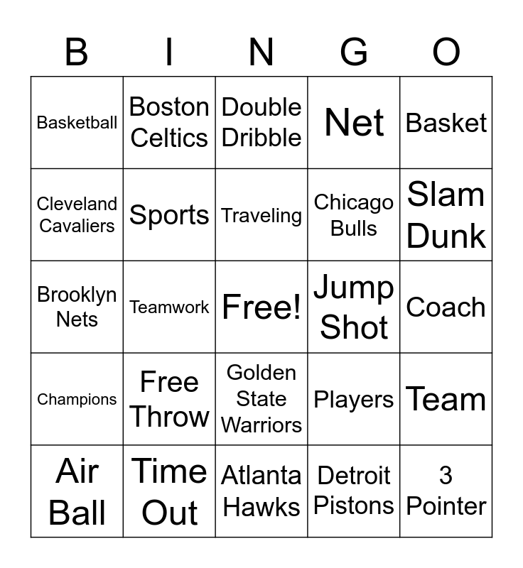 This bingo card has a free space and 36 words: Score, Overtime, Fans, Sports, Players, Champions, Traveling, Lay-up, Basket, Cheerleader, Teamwork, Net, Foul, Jump Shot, Slam Dunk, Basketball, Cheer, Free Throw, 3 Pointer, Double Dribble, Coach, Team, Time Out, Air Ball, Atlanta Hawks, Boston Celtics, Brooklyn Nets, Charlotte Hornets, Chicago Bulls, Cleveland Cavaliers, Dallas Mavericks, Denver Nuggets, Detroit Pistons, Golden State Warriors, Houston Rockets and Indiana Pacers.