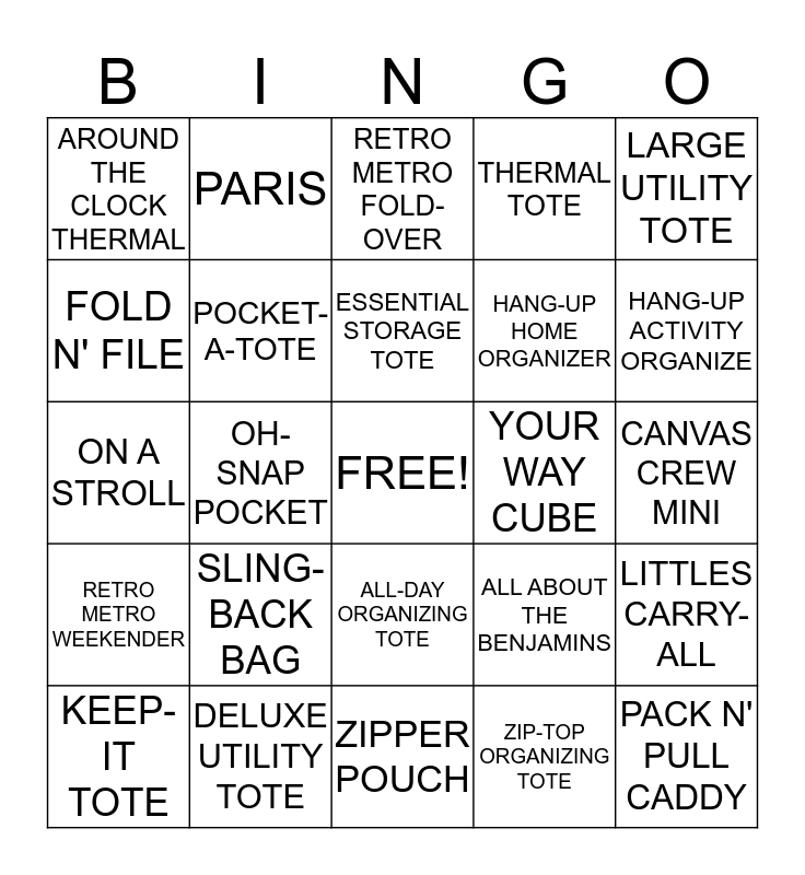 This bingo card has a free space and 26 words: ALL-DAY ORGANIZING TOTE, ZIP-TOP ORGANIZING TOTE, ESSENTIAL STORAGE TOTE, DELUXE UTILITY TOTE, LARGE UTILITY TOTE, AROUND THE CLOCK THERMAL, FOLD N' FILE, PARIS, CANVAS CREW MINI, ALL ABOUT THE BENJAMINS, HANG-UP HOME ORGANIZER, ON A STROLL, LITTLES CARRY-ALL, KEEP-IT TOTE, OH-SNAP POCKET, OH-SNAP BIN, THERMAL TOTE, RETRO METRO WEEKENDER, RETRO METRO FOLD-OVER, PACK N' PULL CADDY, HANG-UP ACTIVITY ORGANIZE, ZIPPER POUCH, YOUR WAY CUBE, SLING-BACK BAG, POCKET-A-TOTE and HOSTESS ONLY TRUE BEAUTY.