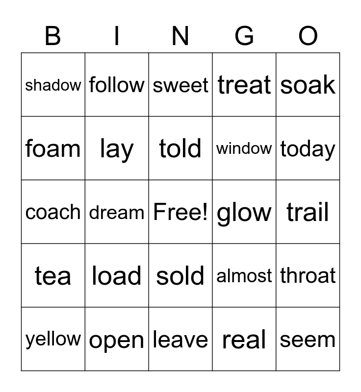 This bingo card has a free space and 24 words: load, open, told, yellow, soak, shadow, foam, follow, glow, sold, window, coach, almost, throat, lay, real, trail, sweet, today, dream, seem, tea, treat and leave.