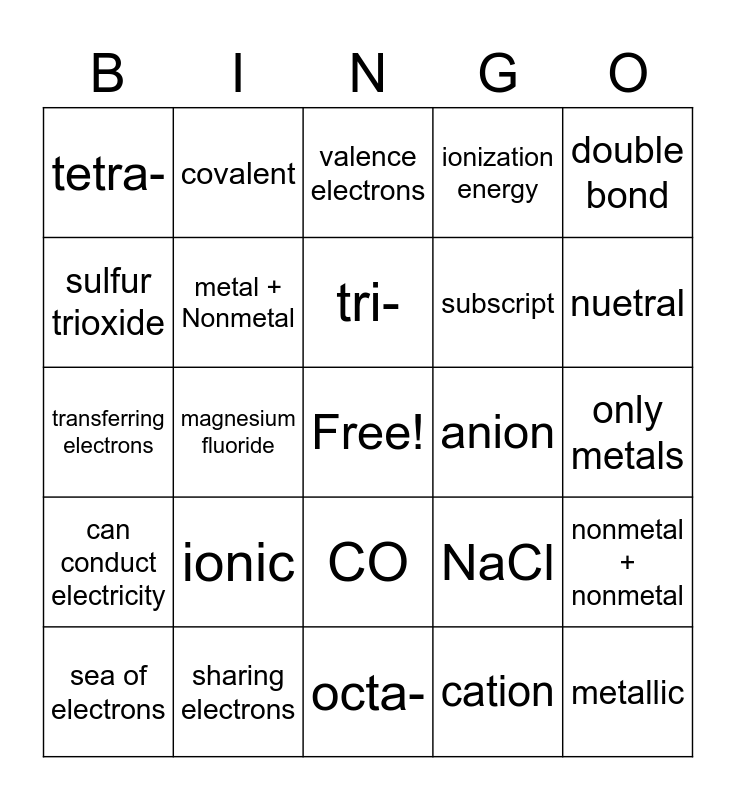 This bingo card has a free space and 24 words: ionic, sharing electrons, tri-, sea of electrons, double bond, tetra-, sulfur trioxide, covalent, anion, CO, subscript, transferring electrons, NaCl, nonmetal + nonmetal, metal + Nonmetal, cation, only metals, valence electrons, nuetral, magnesium fluoride, metallic, can conduct electricity, ionization energy and octa-.