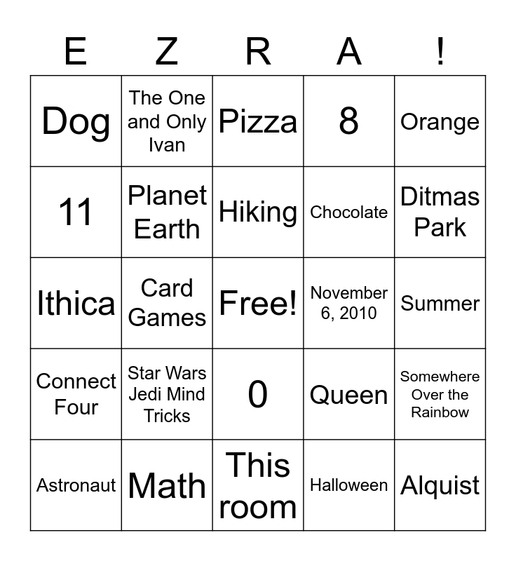 This bingo card has a free space and 24 words: Star Wars Jedi Mind Tricks, Math, Hiking, Astronaut, Orange, Dog, 11, The One and Only Ivan, November 6, 2010, 0, Chocolate, Ithica, Queen, Somewhere Over the Rainbow, Planet Earth, Halloween, Summer, Pizza, Ditmas Park, Card Games, Alquist, Connect Four, 8 and This room.